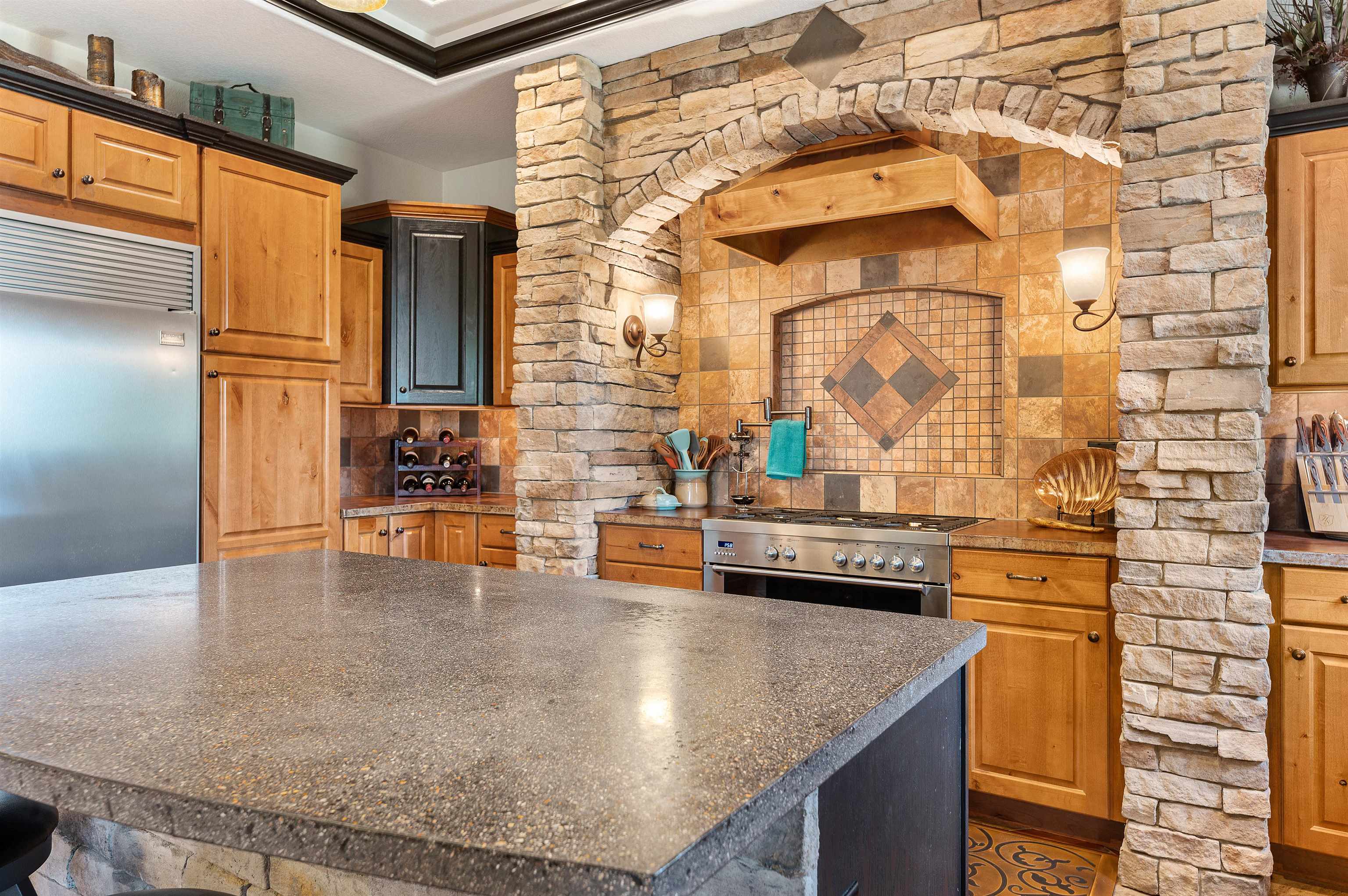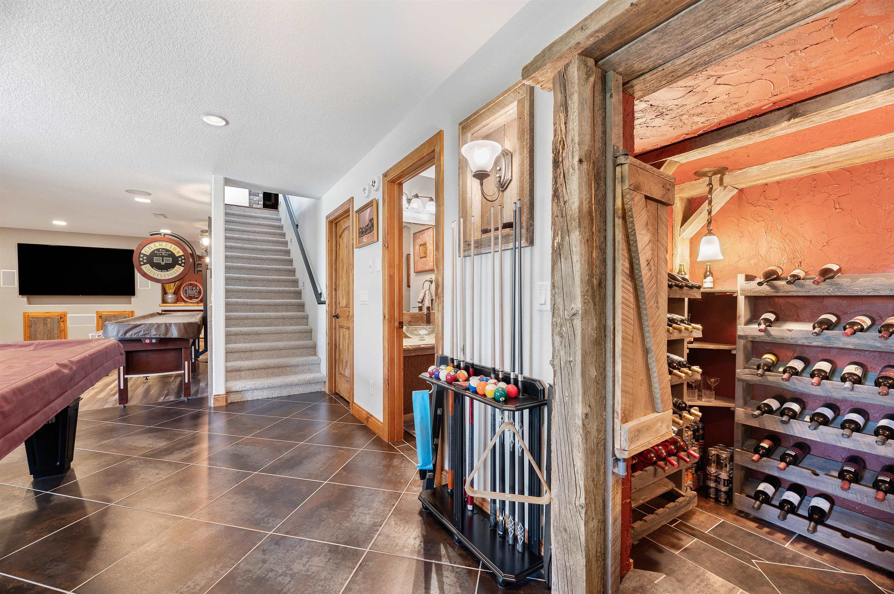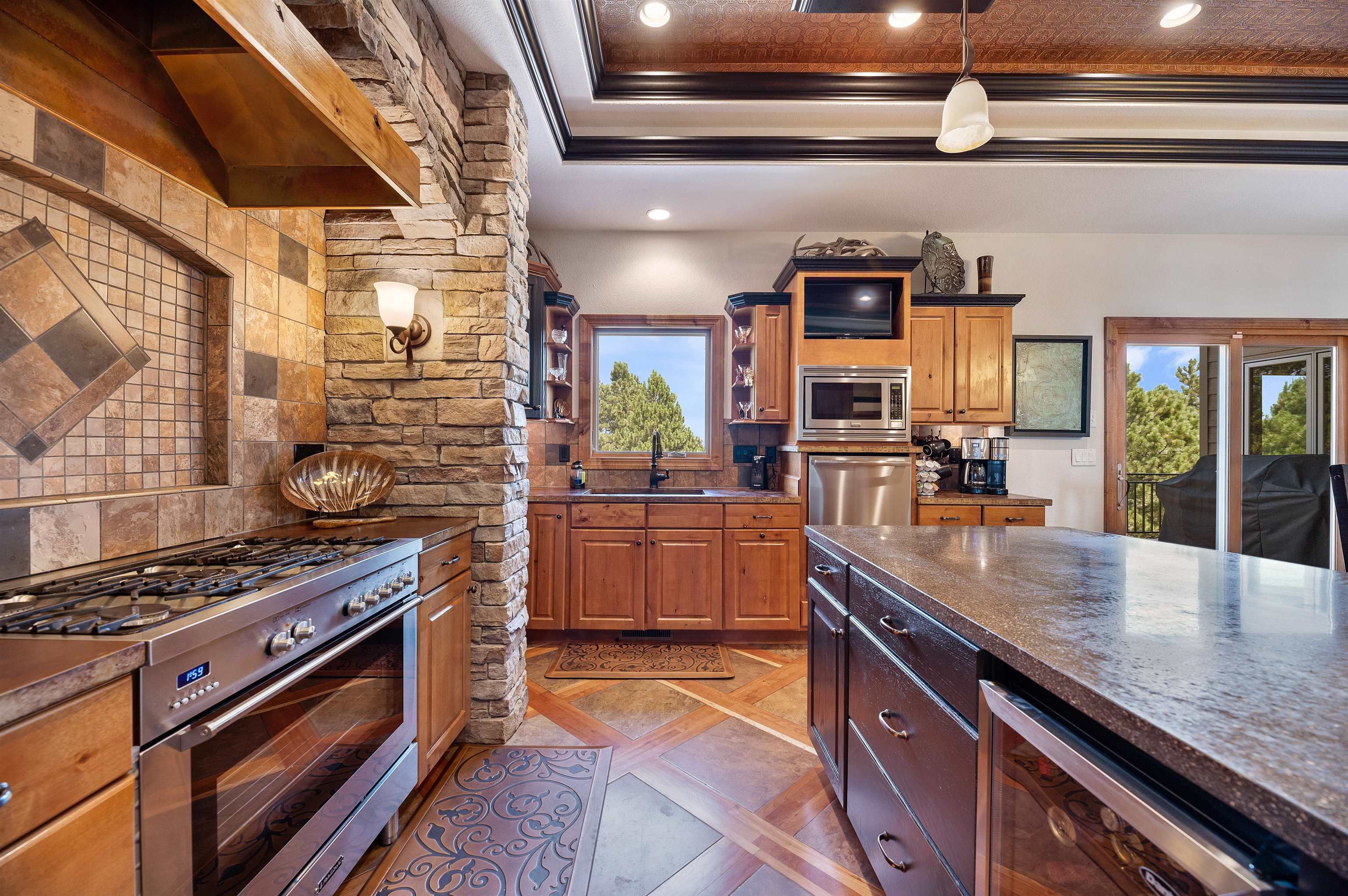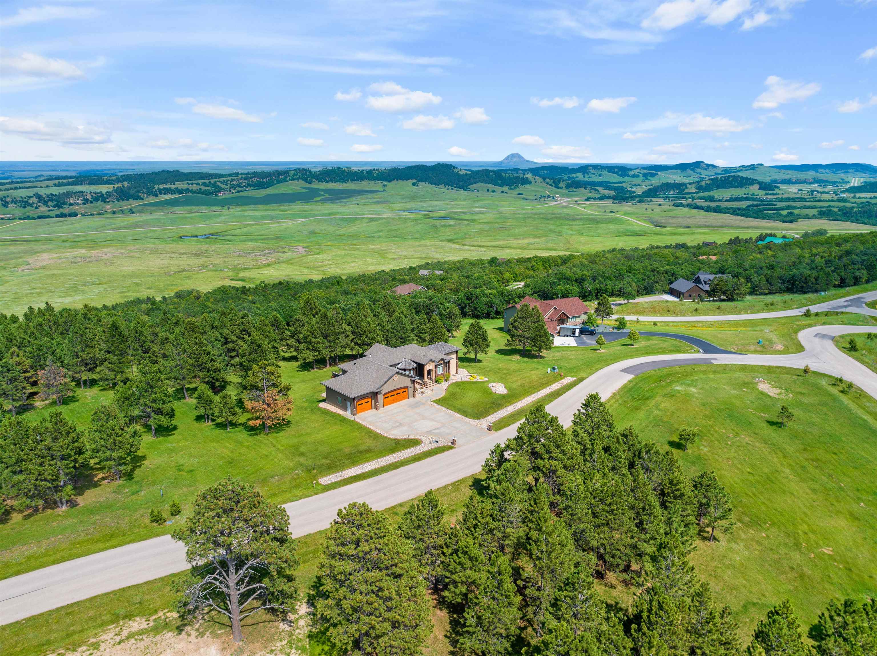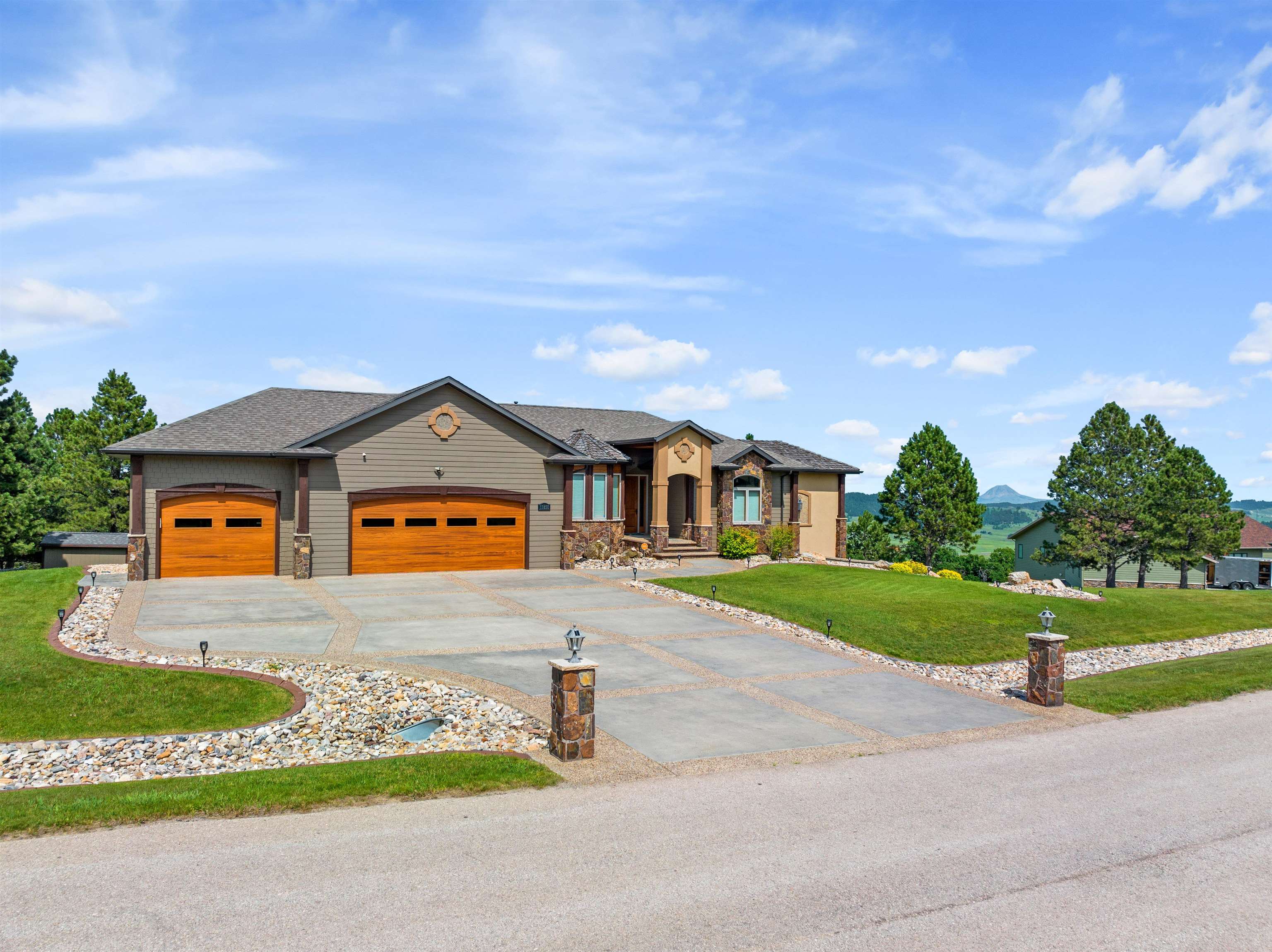 Listed with Spencer Rossi, Top Shelf Realty, 605-269-1600. Meticulously maintained, exquisitely crafted, 2.5-acre entertainer with main level living and a view of Bear Butte in the beautiful Frawley Ranch Development with paved streets and natural gas! This home has so many unique, multi-textured features that you must see for yourself! From wood inlay to stain glass pillars, tile to copper/lighted tray ceilings, no part of this house has been overlooked! A sealed, decorative concrete driveway leads to a water feature entrance into a well-appointed, open concept kitchen/dining/living room with a waterfall feature gas fireplace and wood pillars. The primary bedroom on the main level hosts an extraordinary walk-in closet with laundry and offers deck access to a private outdoor seating area. The expansive deck is the perfect place to start or end your day, enjoying a view, privacy and wildlife watching. The attached three car heated garage features painted floor, floor drain, hot/cold water and new insulated garage doors with plenty of storage space. Head downstairs to the ultimate game room with custom wet bar, cozy wine tasting cellar, space for a pool table and card games by the gas fireplace with walk out access to the back yard.