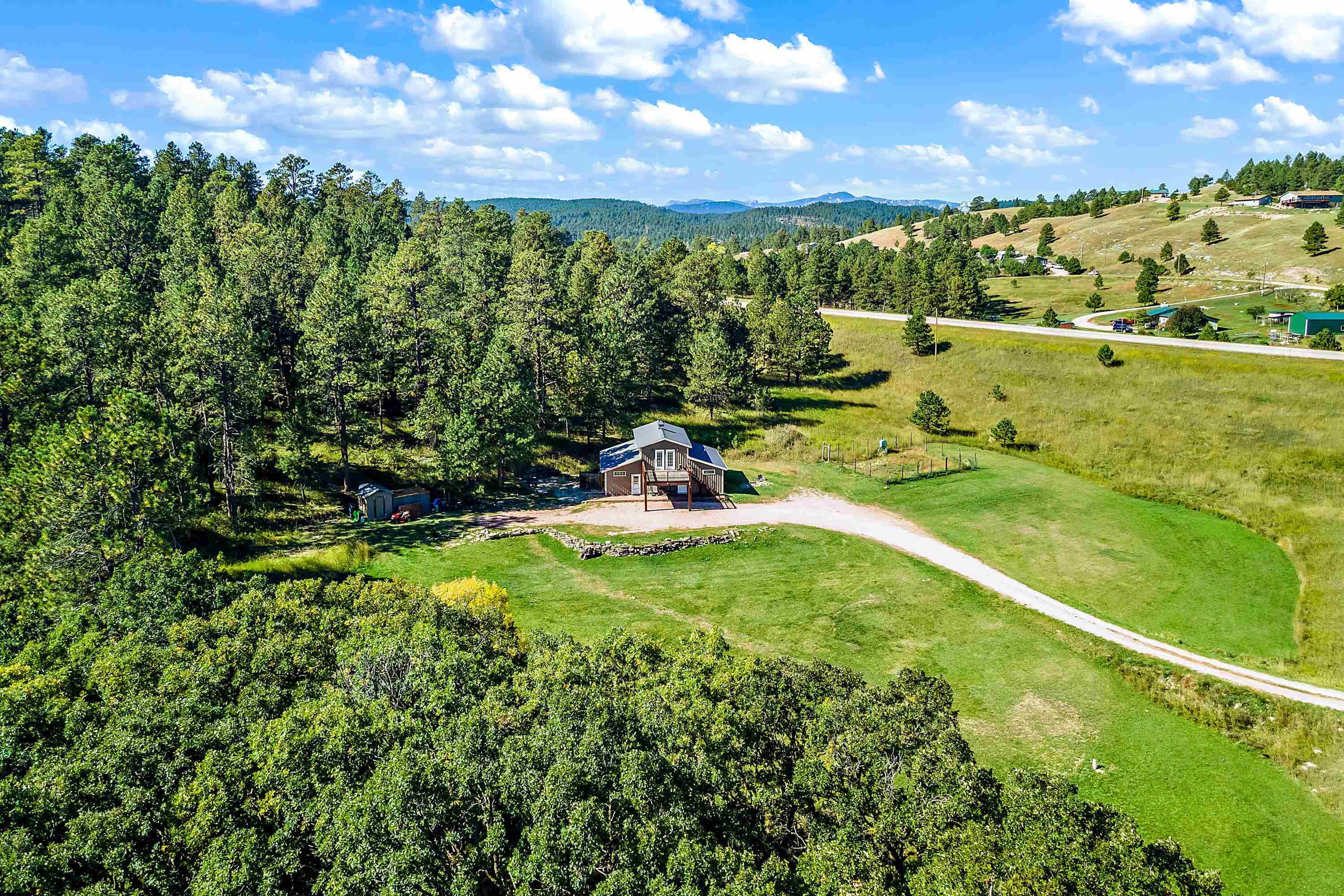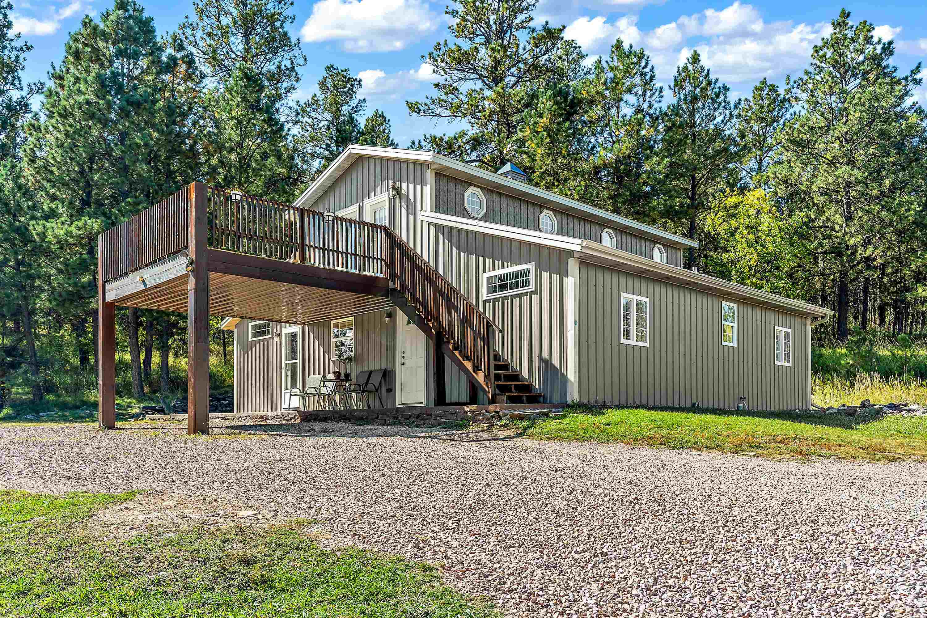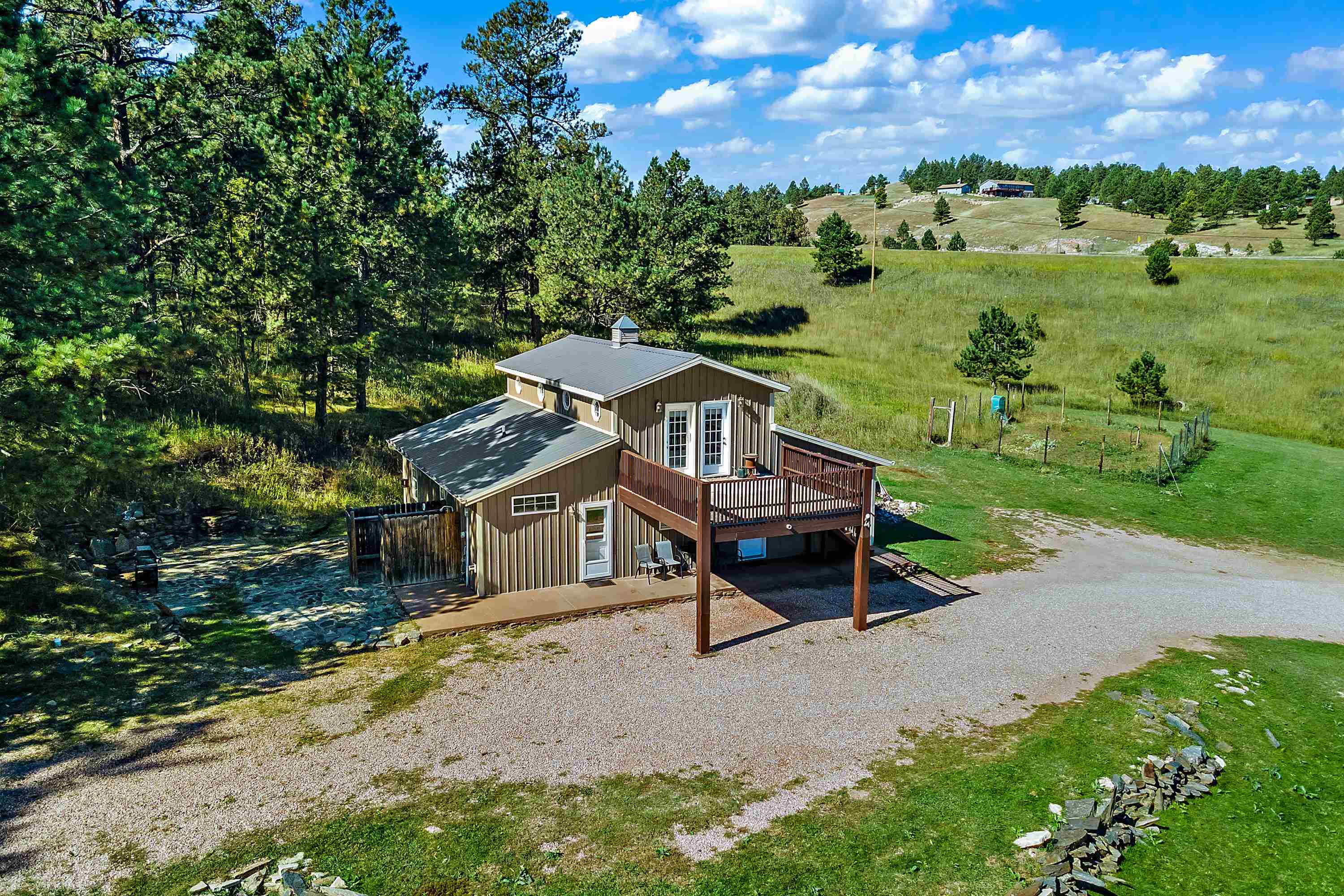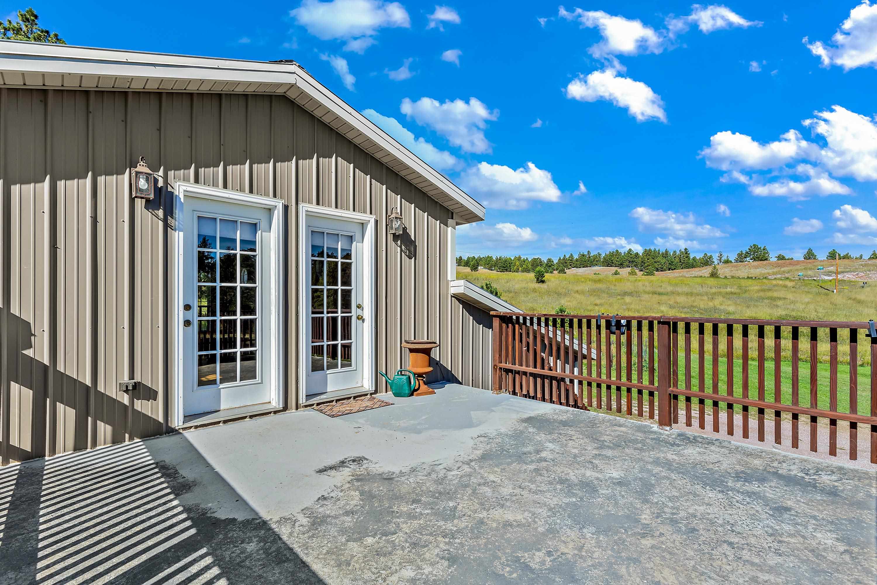 Listed by Cody Brown, Engel & Voelkers Black Hills LLC, 402-910-3553. Sale blew at no fault to the sellers (buyer's financing fell through)! Stop what you are doing and check this one out! No covenants, so you have the freedom to have chickens and other fun farm animals allowed by Pennington County acreage ordinances. Plenty of room to expand and build a garage or shop. There is already a shed with power to it near the home. This post framed house, located in between Hermosa and Keystone, features three bedrooms, two full bathrooms, a loft, and acreage! The main floor has three bedrooms, two bathrooms, laundry room, kitchen, and family room. One of the bedrooms and bathrooms on the main level is the master suite which includes a walk in closet and master bathroom. Radiant heated concrete floors with a finish stain. The loft could be used as an office or an additional bedroom and features a walk out deck that has beautiful views of the surrounding hills and trees. The deck has steps that also lead to the front of the home.