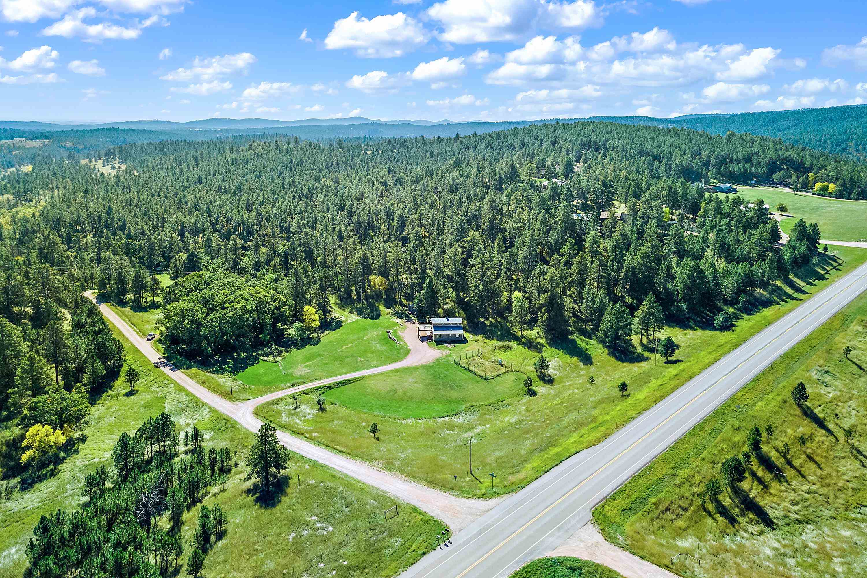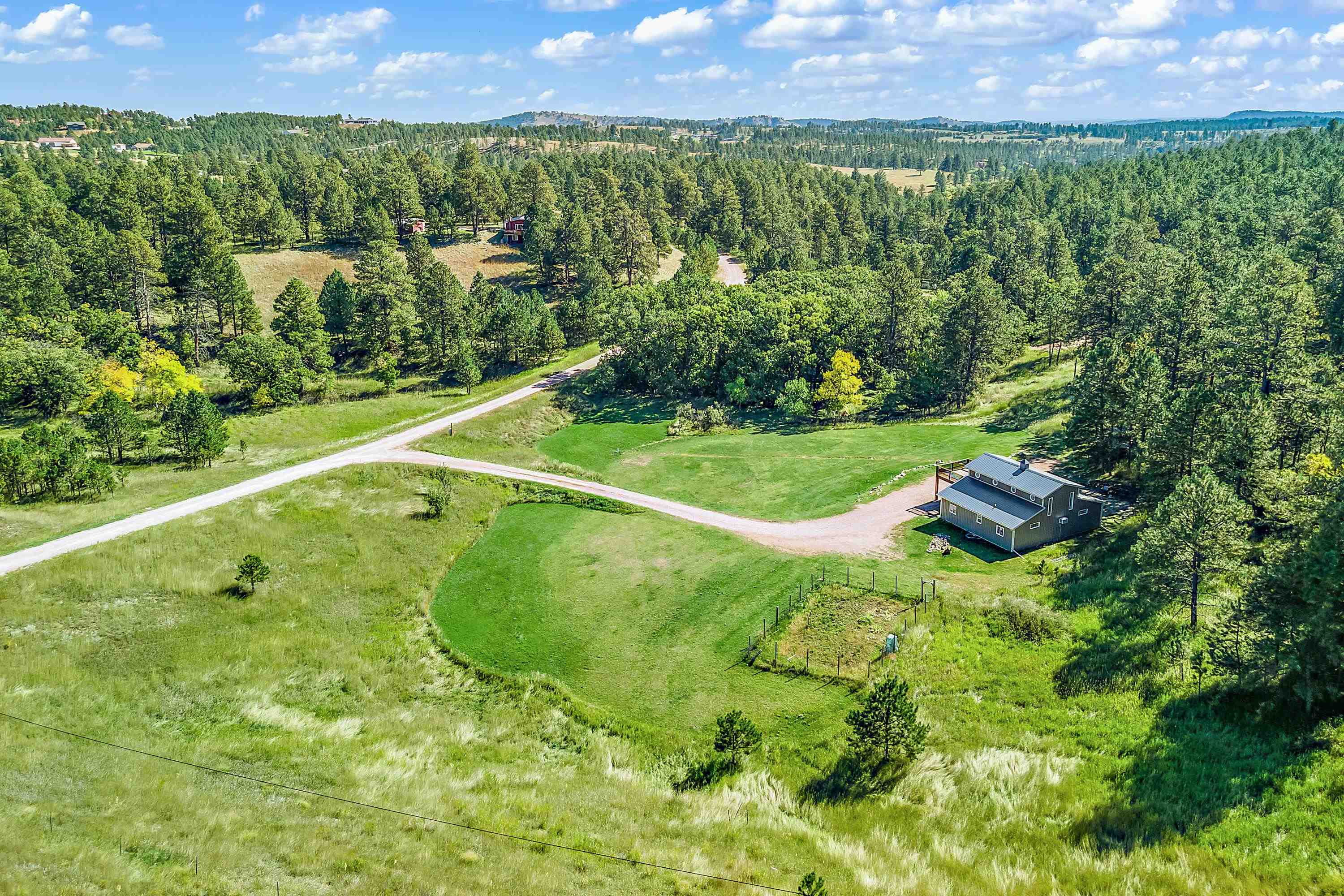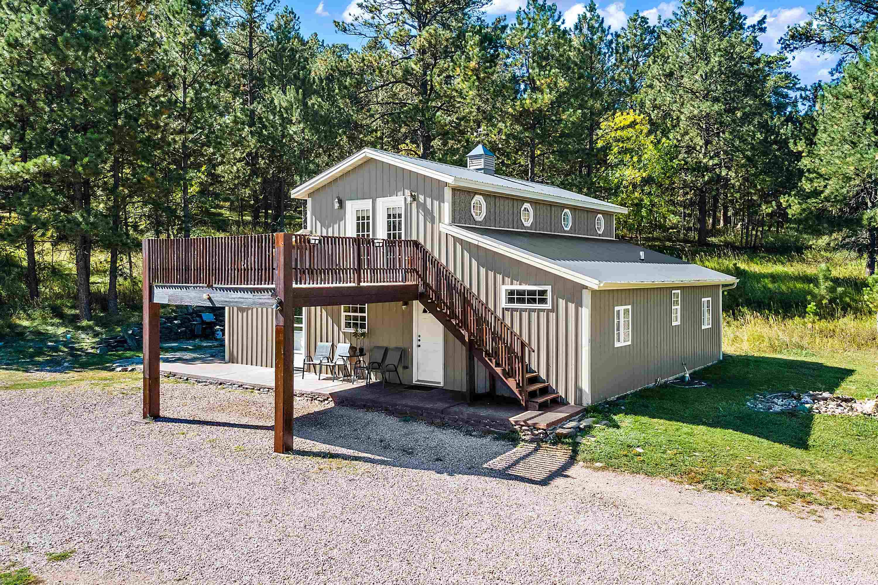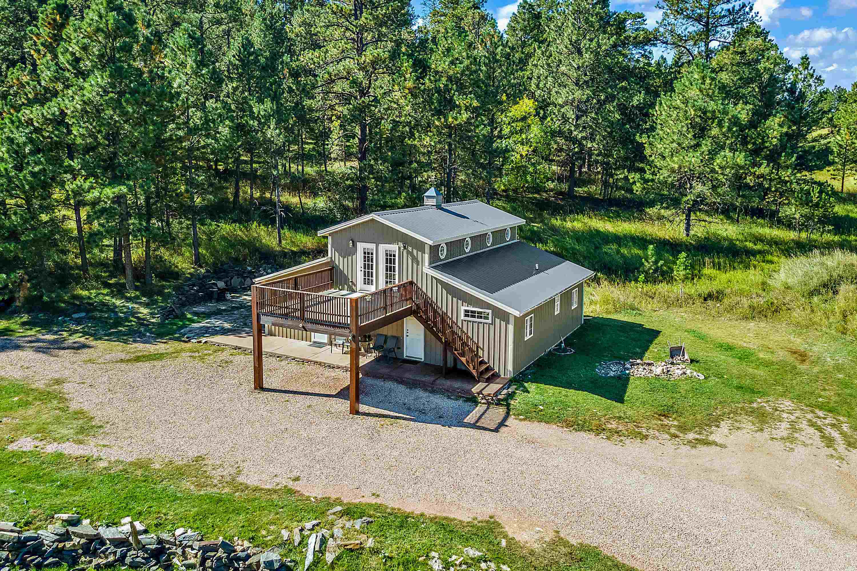 Listed by Cody Brown, Engel & Voelkers Black Hills LLC, 402-910-3553. Sale blew at no fault to the sellers (buyer's financing fell through)! Stop what you are doing and check this one out! No covenants, so you have the freedom to have chickens and other fun farm animals allowed by Pennington County acreage ordinances. Plenty of room to expand and build a garage or shop. There is already a shed with power to it near the home. This post framed house, located in between Hermosa and Keystone, features three bedrooms, two full bathrooms, a loft, and acreage! The main floor has three bedrooms, two bathrooms, laundry room, kitchen, and family room. One of the bedrooms and bathrooms on the main level is the master suite which includes a walk in closet and master bathroom. Radiant heated concrete floors with a finish stain. The loft could be used as an office or an additional bedroom and features a walk out deck that has beautiful views of the surrounding hills and trees. The deck has steps that also lead to the front of the home.