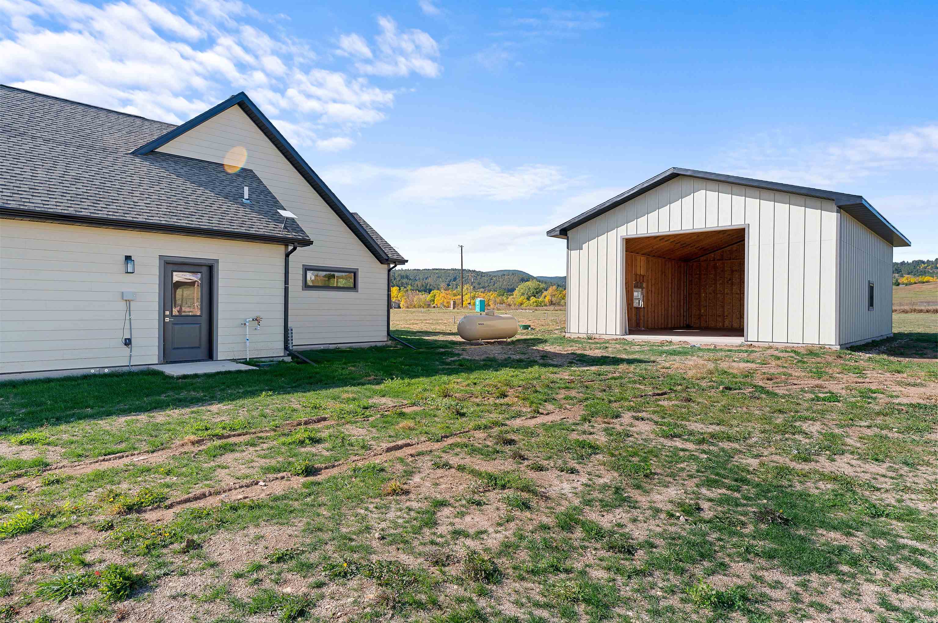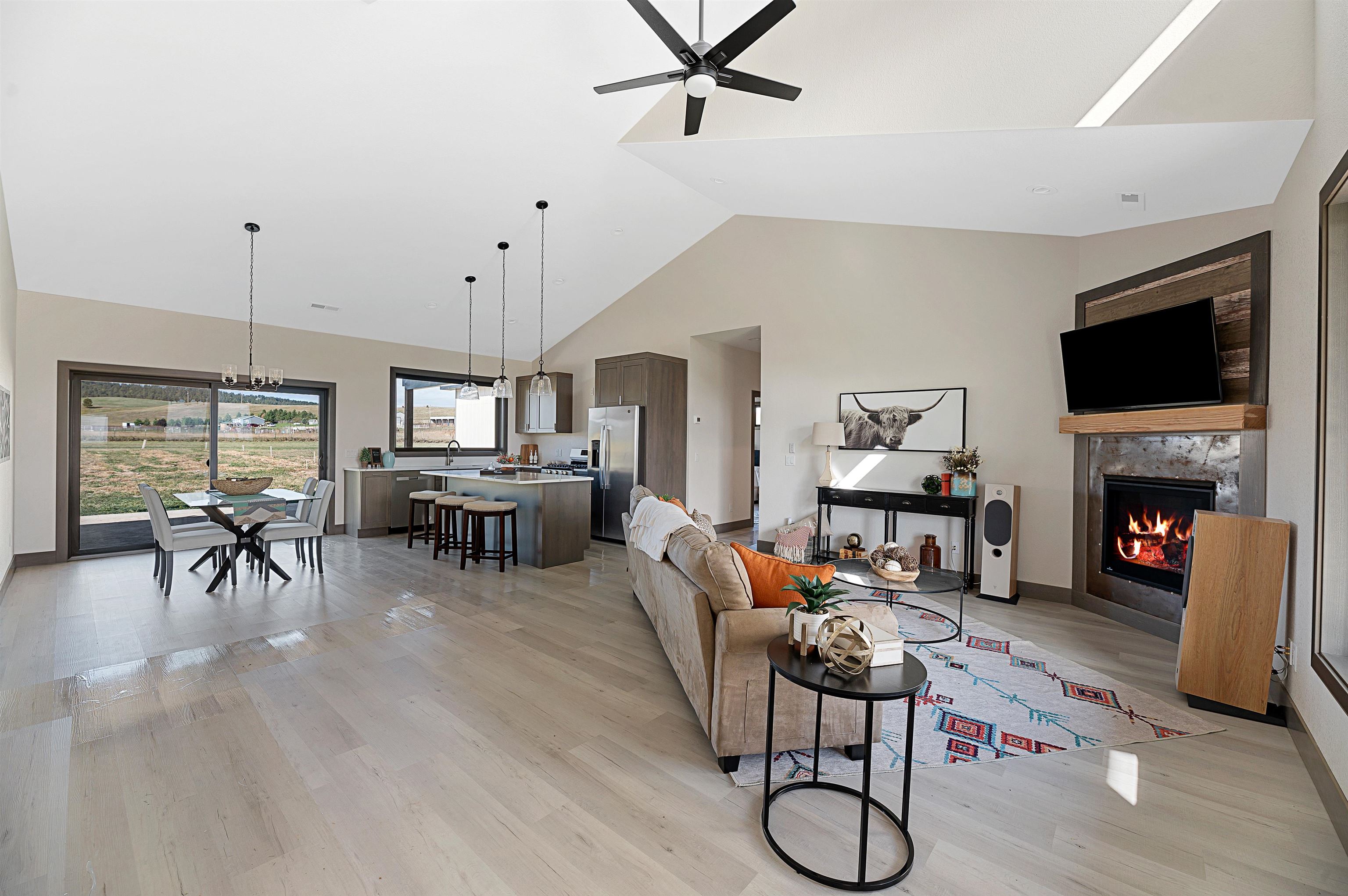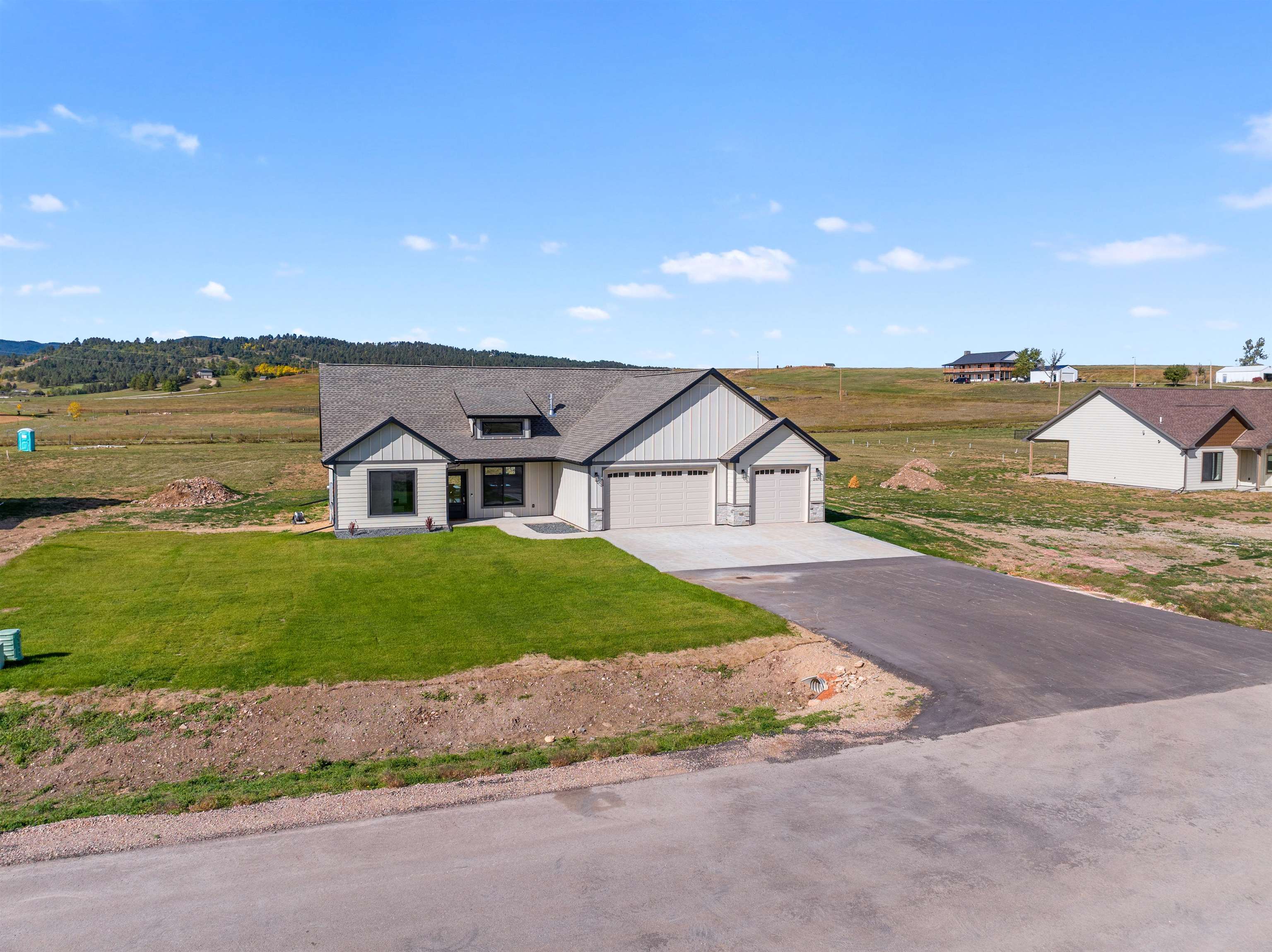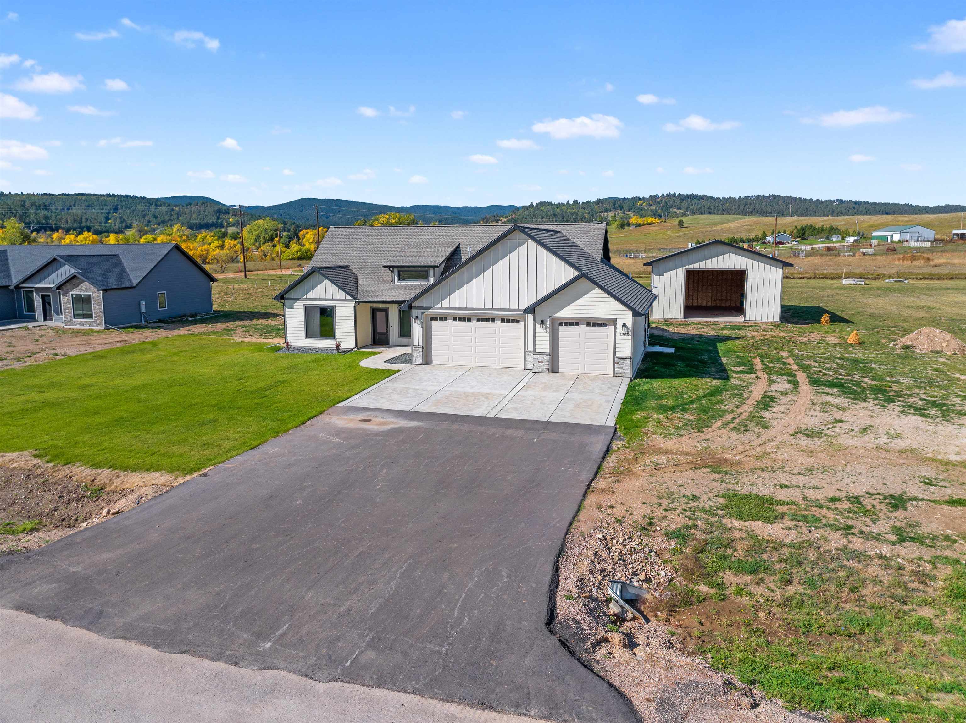 For more information, please contact listing agents Heath Gran 605-209-2052 or Michael Warwick 605-641-2569 with Great Peaks Realty. Welcome to this modern, elegant home in the Pleasant Valley Estates Community! This new construction home is move-in ready with 3 bedrooms, 2 bath and a 3 car garage. This home offers an open concept layout, a cozy rustic fireplace, stunning kitchen with quartz countertops, and detached shop space. Come enjoy the views of the Black Hills while only being minutes from Sturgis.