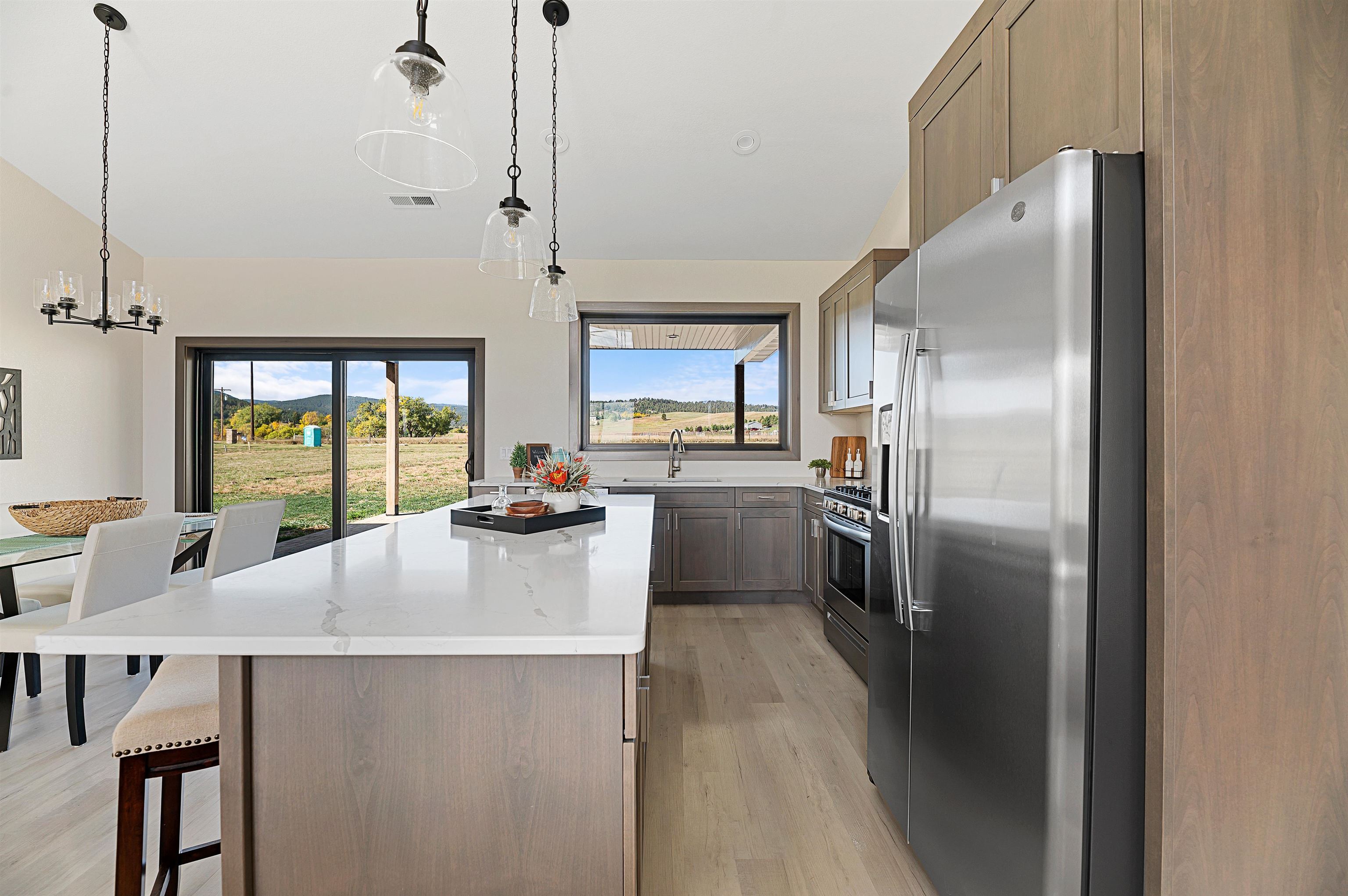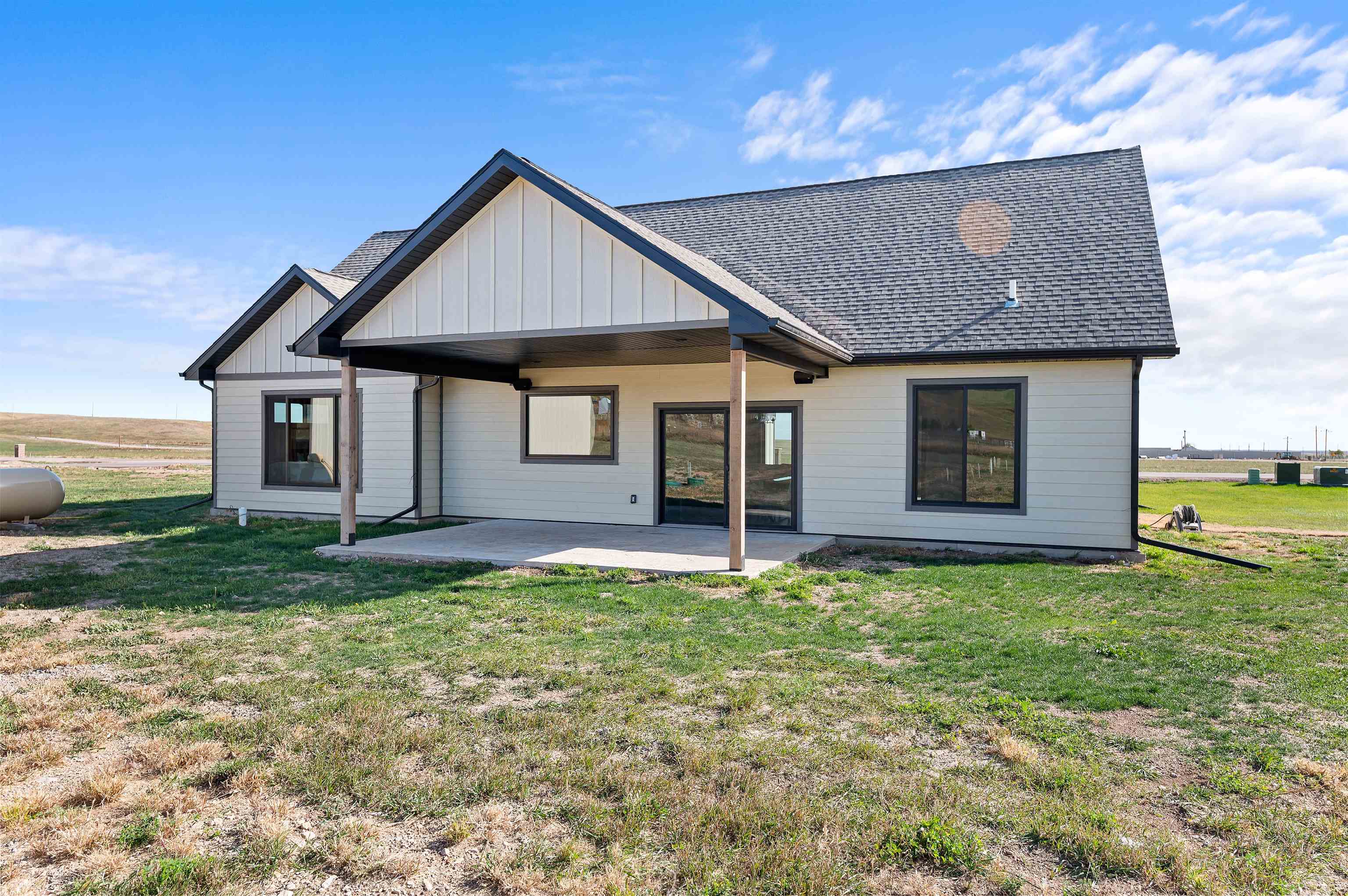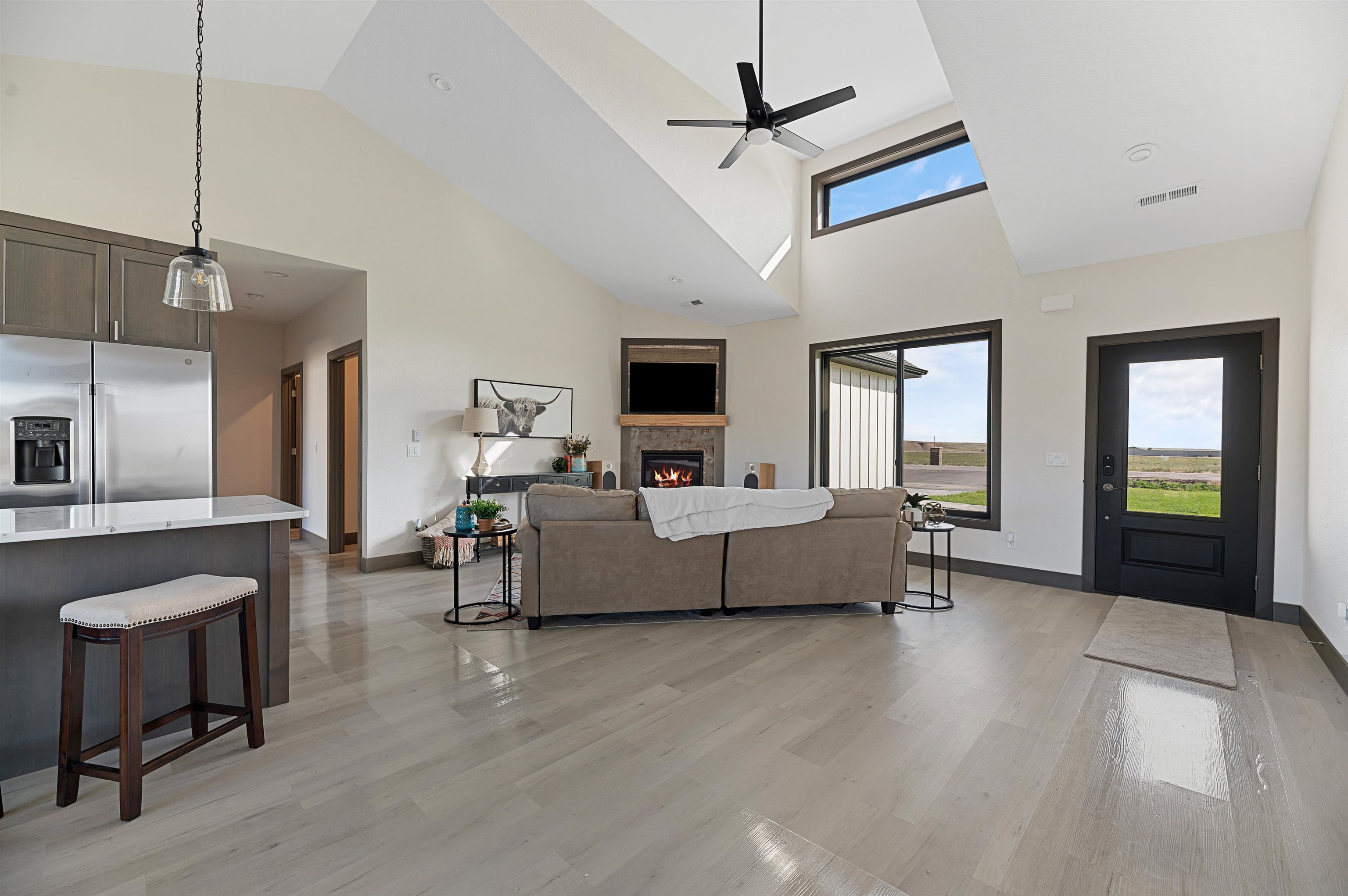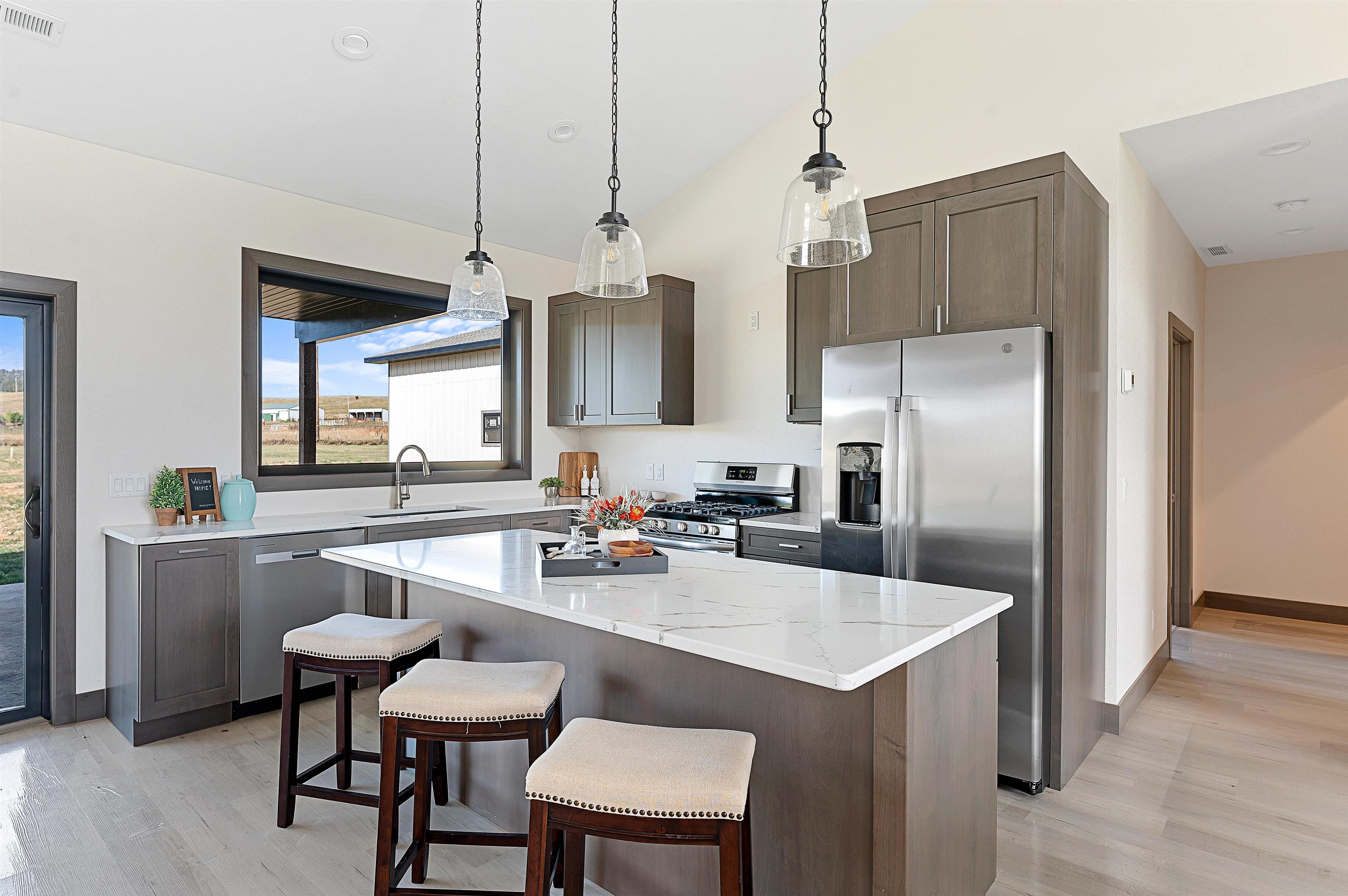 For more information, please contact listing agents Heath Gran 605-209-2052 or Michael Warwick 605-641-2569 with Great Peaks Realty. Welcome to this modern, elegant home in the Pleasant Valley Estates Community! This new construction home is move-in ready with 3 bedrooms, 2 bath and a 3 car garage. This home offers an open concept layout, a cozy rustic fireplace, stunning kitchen with quartz countertops, and detached shop space. Come enjoy the views of the Black Hills while only being minutes from Sturgis.